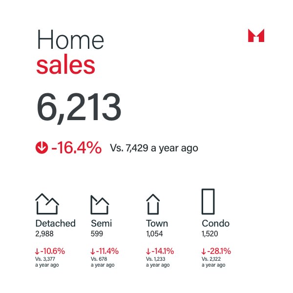 Sales across all housing types were down year-over-year, with notable declines in semi-detached homes and condos. Here are the specific numbers: